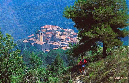 Über dieselbe GR 51 verlassen wir am nächsten Morgen das Städtchen. Wieder die üppigen Terrassen über Gorbio. Ste. Agnès, bietet einen erheblich raueren Anblick. Es liegt auch gut 400 m höher, zum Schutz gegen Angriffe der Sarazener auf einem Berggipfel. Genauer gesagt, hinter dem Gipfel: von der Küste aus ist nichts davon zu sehen. Dennoch war es nicht die Lage, die Meerespiraten abhielt, sondern das Dorfmädchen Anne. Haroum, ein mächtiger Sarazener, war so von ihrer Schönheit und Tapferkeit beeindruckt, dass er ihre Forderungen für eine Hochzeit erfüllte: Beendigung der Piraterie und Bekehrung zum Christentum.
