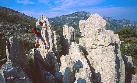 Nach dem Col de la Madone de Gorbio wechselt die Stimmung. Kahl wird es, ein Land der Disteln, denn poröser Kalkstein lässt hier jegliches Wasser verschwinden. Aber es wäre nicht die Côte, wenn nicht auch diese Disteln größer und schöner wären, himmelblau mit türkisfarbenen Blättern. Einige Stellen sind vegetationslos. Das versickernde Wasser hat Stück für Stück den Kalk gelöst, meterhohe, messerscharfe Finnen hinterlassend. Ein Musterbeispiel einer Karstlandschaft.